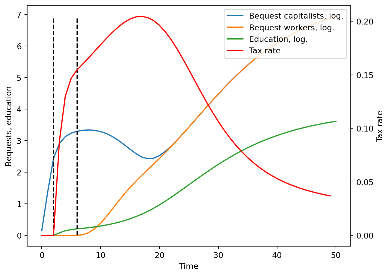 Such an economy shifts from having to classes of people to only one, where everybody owns capital. The critical transition occurs because of, eventually, capitalists find it optimal to impose a tax on themselves to finance public education. With it, and as wages keep increasing, workers are eventually able to give bequests, thus becoming capitalists. Instead of detailing the exact process (check the reference), we will simulate the economy for a set of parameters.