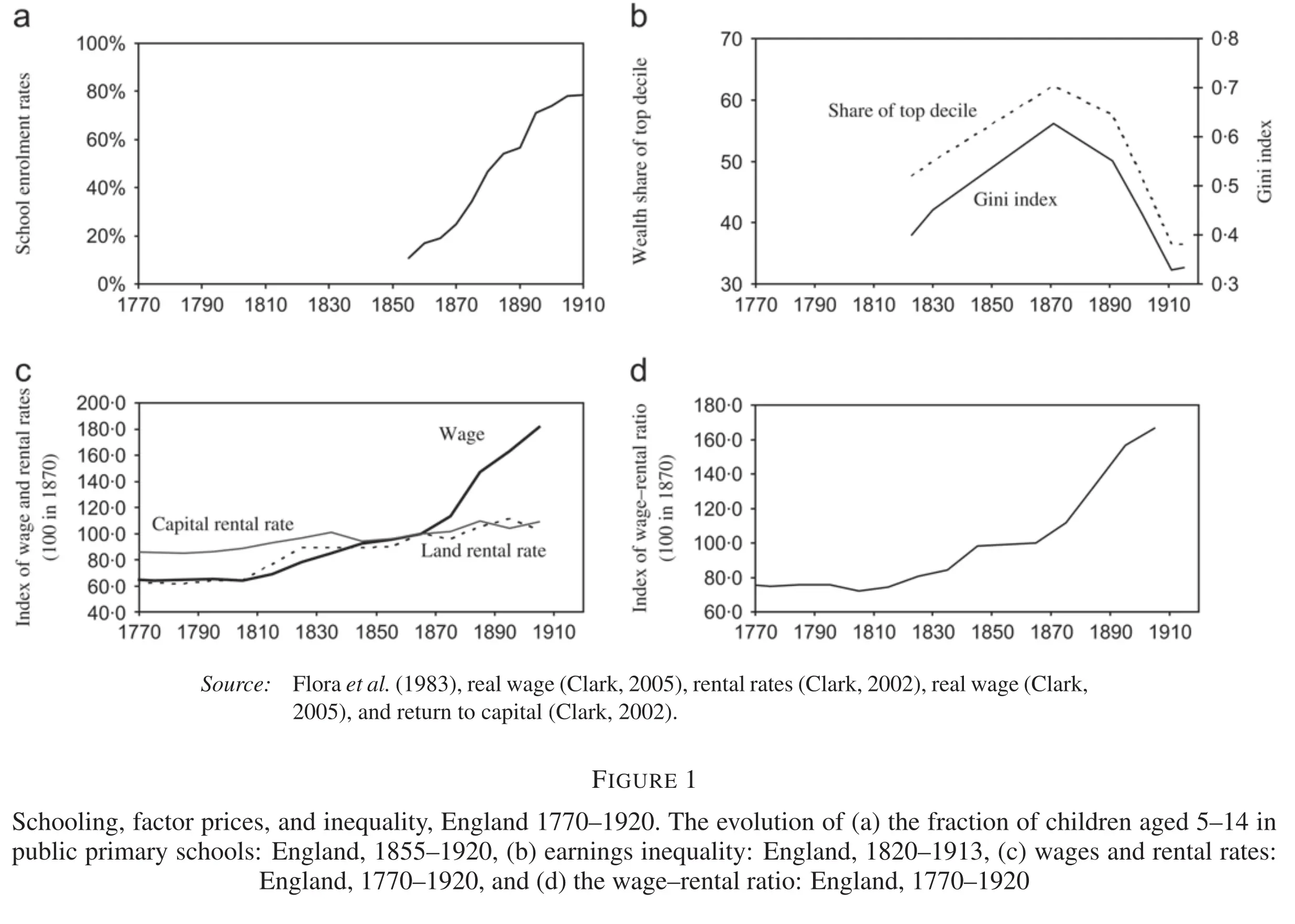 The paper is set-up after the industrial revolution, let’s say around 1850 and is meant to describe the transition of the modern economies between that time and the beginning of the 20th century. The authors motivate the paper by showing that during this time, school enrolment rates increased while, at the same time, inequality decreased: the demise of classes. The theory the authors propose parallels this evolution. Furthermore, they supplement the model with econometrics that are compatible with the predictions of the model.