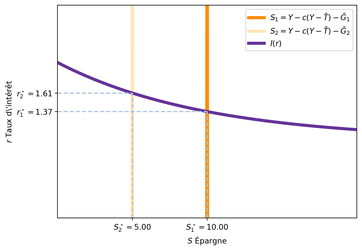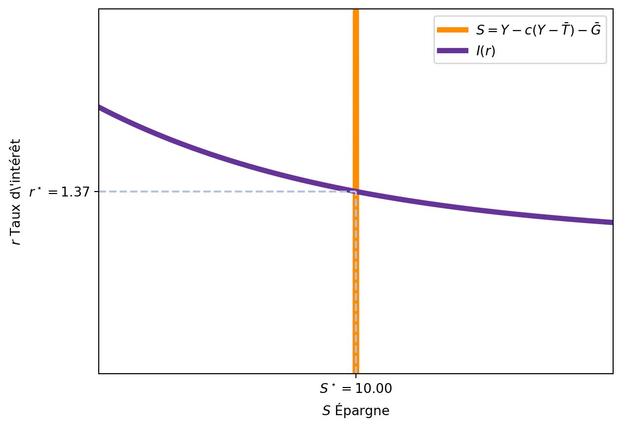 La partie gauche de l’équation représente l’épargne totale de l’économie, qui est égale à l’investissement des entreprises (\(I(r)\)) pour un taux d’intérêt donné (\(r\)). Cette épargne totale est la somme de l’épargne des ménages et de l’épargne du gouvernement.