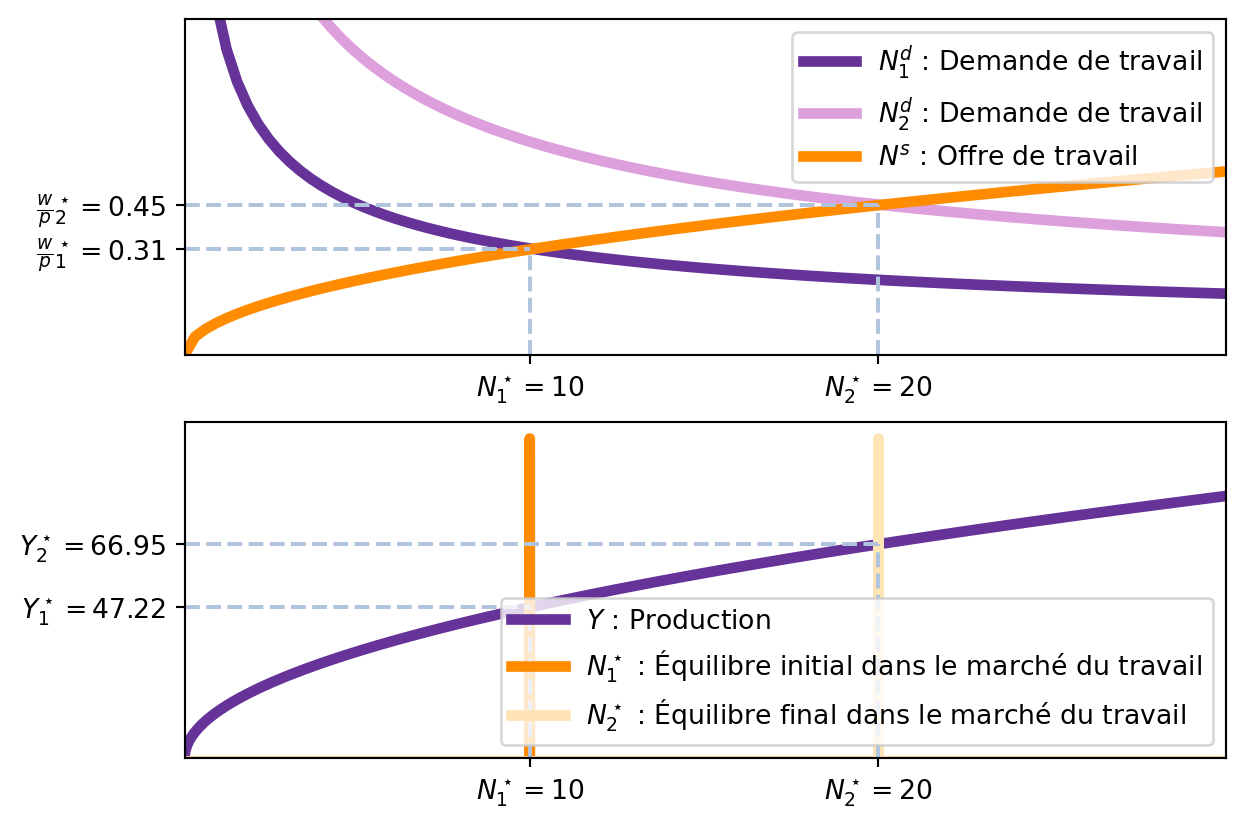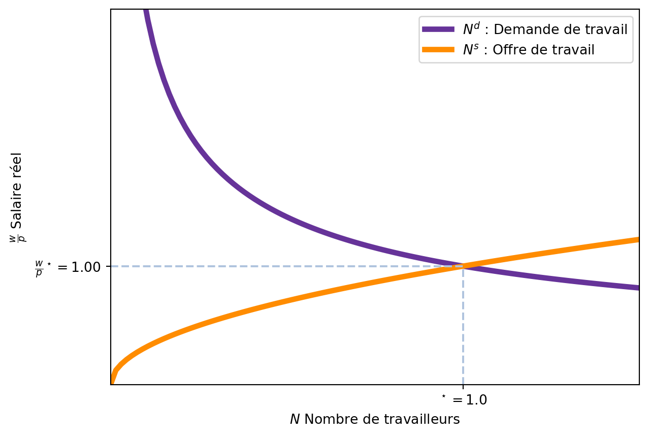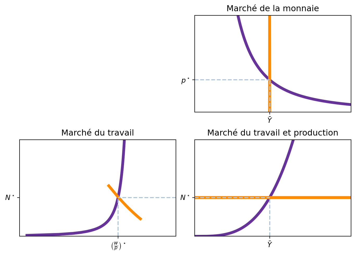 Le marché de la monnaie ajuste le niveau des prix \(p\) pour que l’offre de monnaie coïncide avec le niveau de production (en considérant la vitesse de circulation de la monnaie). Avec le niveau de prix \(p\), le salaire nominal est aussi établi : \(w = \frac{w}{p} \times p.\)