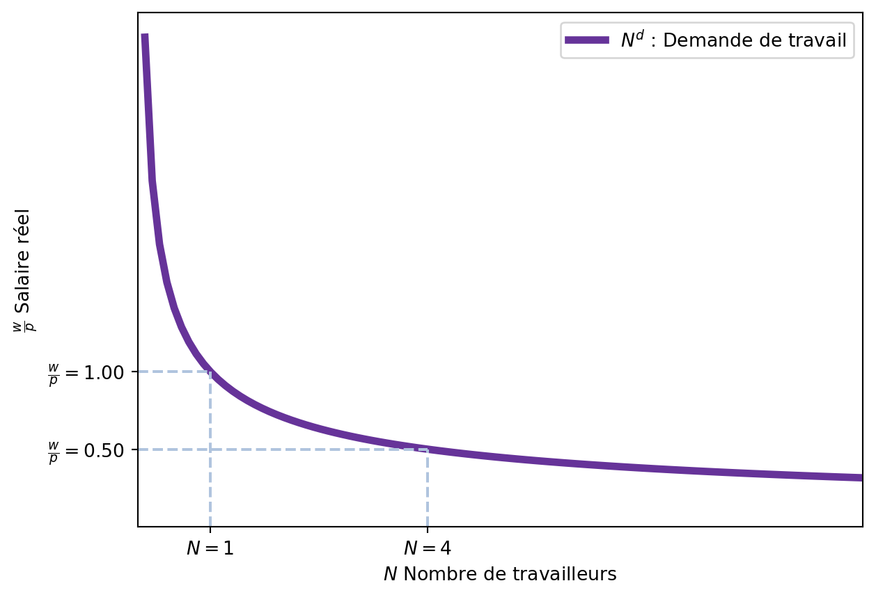 Imaginons que l’économie dispose de 4 unités de capital (\(\bar{K} = 4\)), et que la fonction de production est \(F(\bar{K}, N) = \bar{K}^{0.5} N^{0.5} = 2 N^{0.5}\). Nous pouvons calculer la demande de travail en fonction du salaire réel. Nous savons que les entreprises maximisent leurs profits: