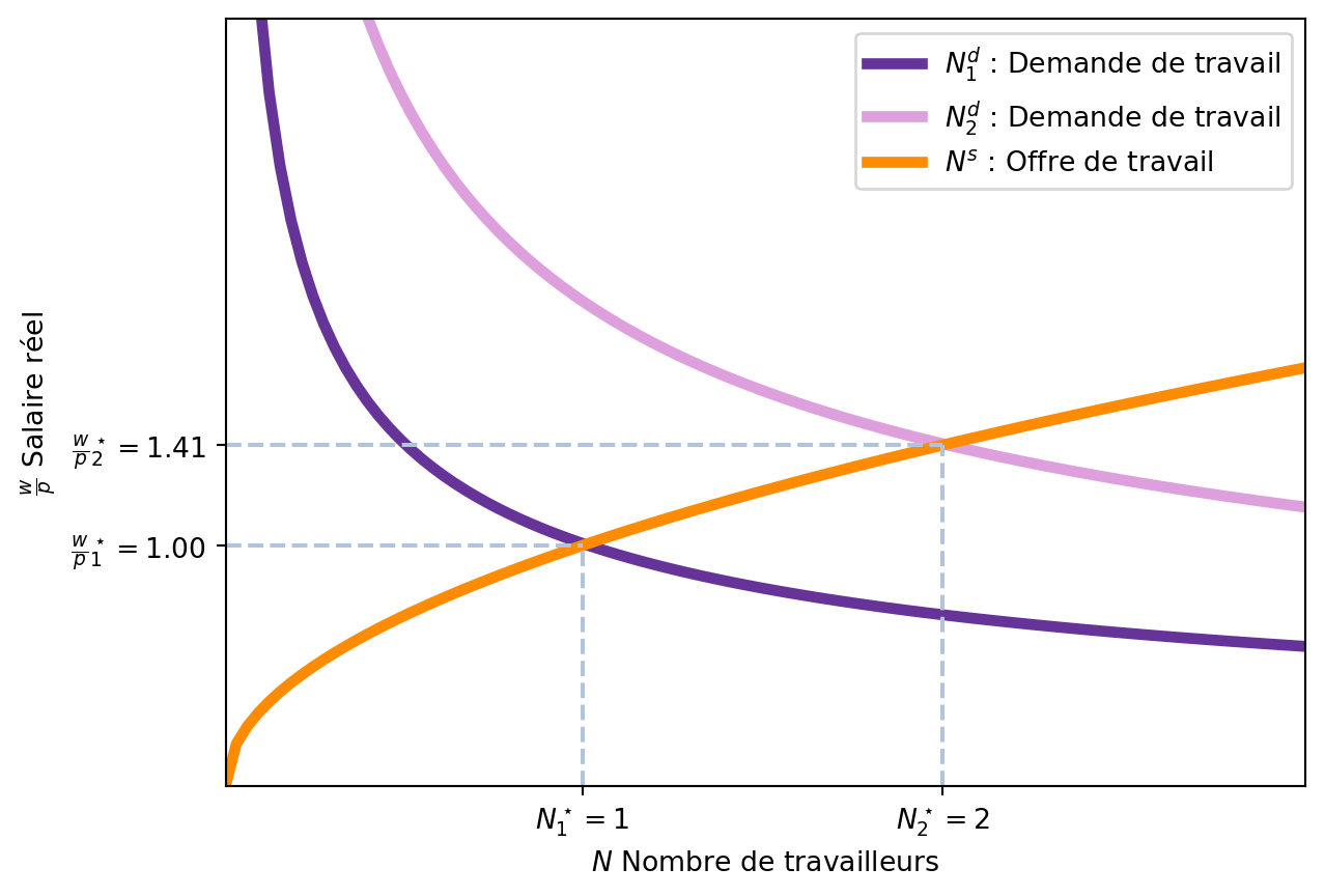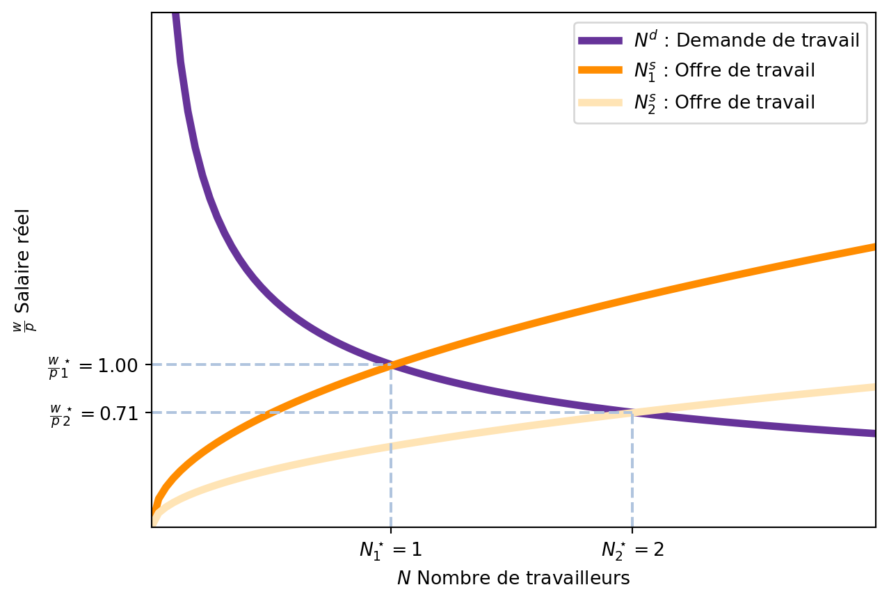 L’offre de travail est une fonction croissante du salaire réel (\(\frac{w}{p}\)). En effet, si le salaire réel augmente, les travailleurs sont incités à travailler plus car ils peuvent acheter plus de biens et services. De plus, si le prix des biens diminue, les travailleurs sont incités à travailler plus car ils peuvent acheter plus de biens et services avec le même salaire.