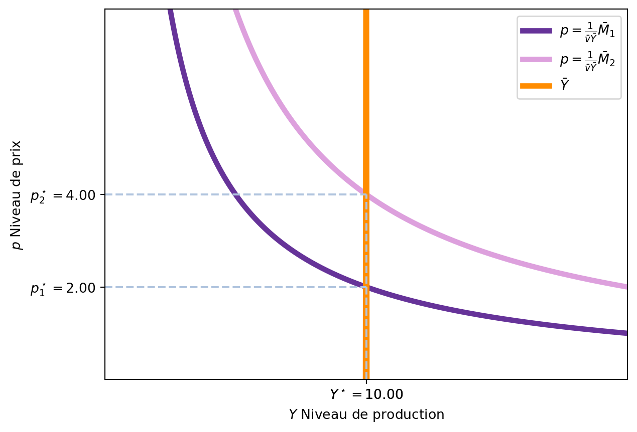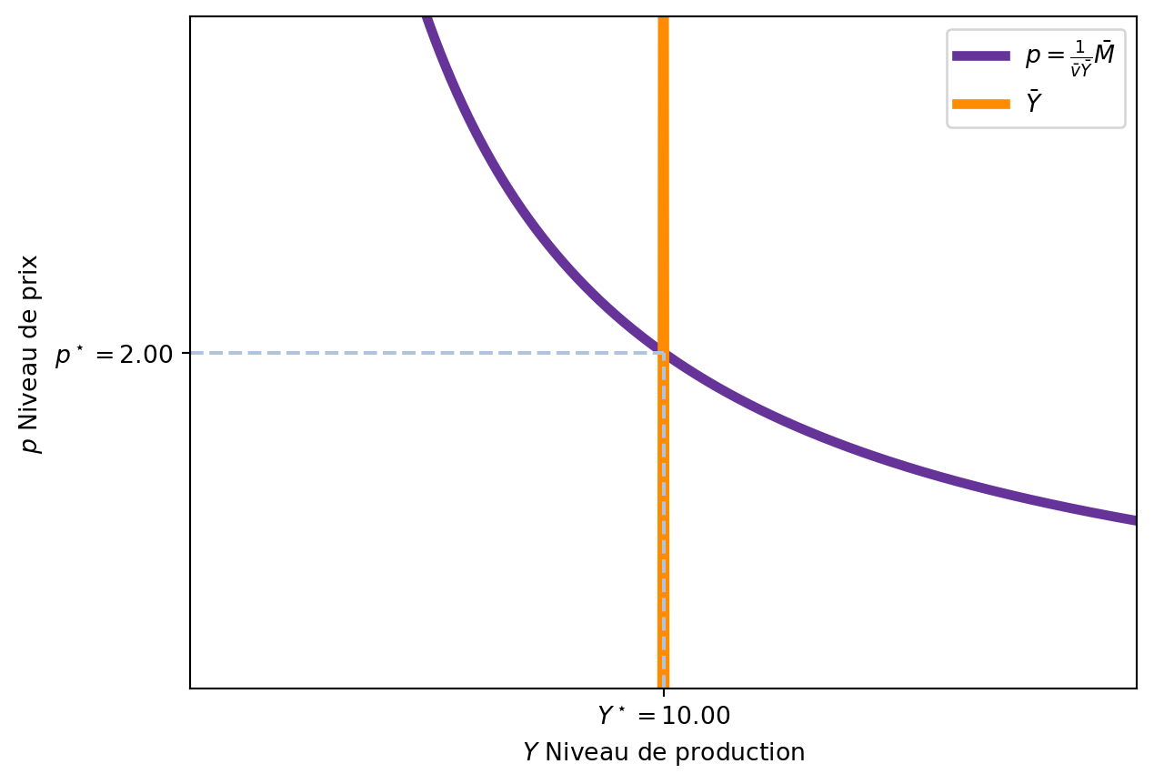 Cette équation indique que le niveau de prix d’équilibre est proportionnel à l’offre de monnaie (\(\bar{M}\)) et inversement proportionnel à la vitesse de circulation de la monnaie (\(\bar{v}\)) et au niveau de production (\(\bar{Y}\)).