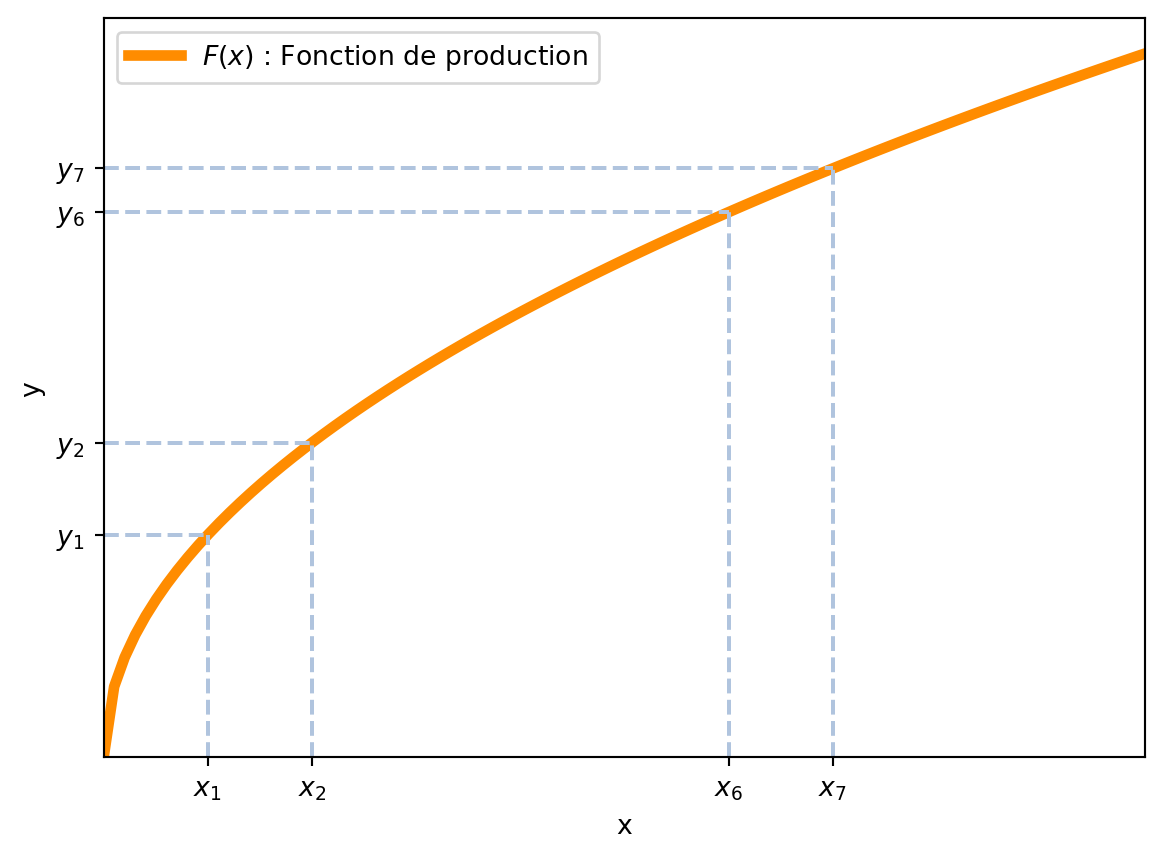 Les rendements décroissants signifient que si l’on augmente un seul facteur (par exemple, le travail \(N\)) en maintenant l’autre (le capital \(K\)) constant, la production augmente mais de moins en moins vite. Mathématiquement, la dérivée seconde de la fonction de production par rapport à \(N\) est négative : \(F_{NN}(K, N) < 0\).