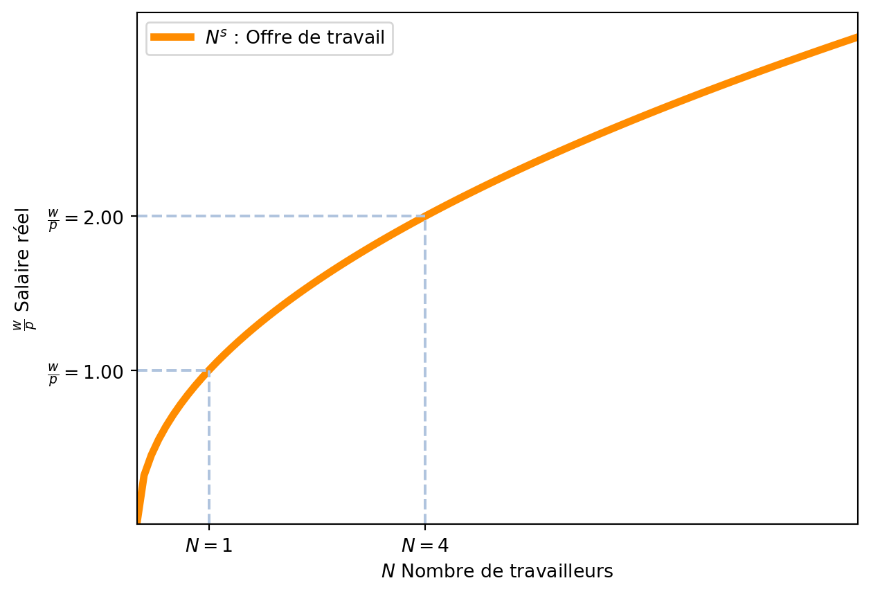 La fonction d’offre de travail est donc croissante par rapport au salaire réel, ce qui signifie que lorsque le salaire réel augmente, l’offre de travail augmente également. Nous notons l’offre de travail par \(N^s = g\left(\frac{w}{p}\right)\).