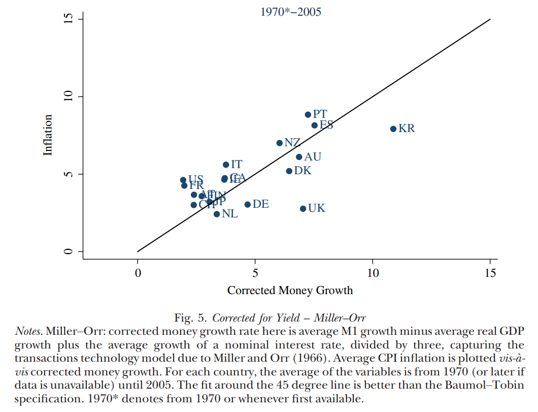 Les économistes Pedro Teles, Harald Uhlig et João Valle e Azevedo ont étudié si les augmentations de l’offre monétaire entraînent effectivement de l’inflation (une fois la croissance du PIB prise en compte). De manière simple, ils tracent le taux de croissance de l’offre monétaire nette de la croissance économique (\(\gamma_M - \gamma_Y\)) contre le taux de croissance des prix (\(\gamma_p\)) et trouvent une relation positive. Selon la Figure 3.10, notre théorie quantitative de la monnaie est assez acceptable.