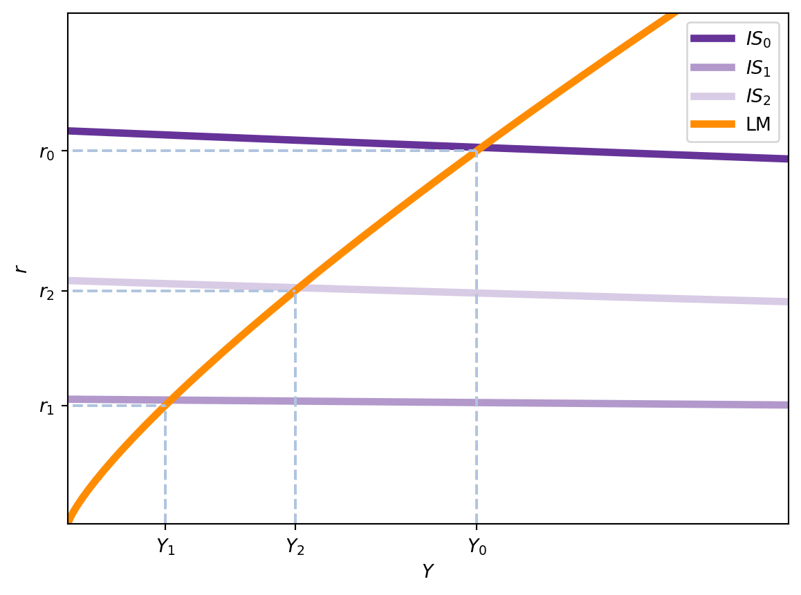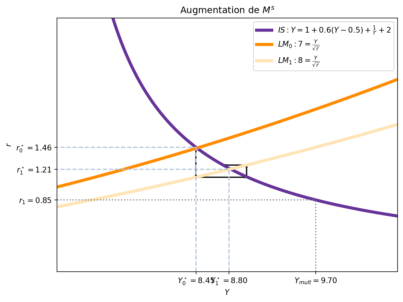 Quand None, et None, le multiplicateur de \(\frac{M^s}{p}\) est de None. Le niveau de revenu qui correspond à \(r_0\) avec la nouvelle courbe LM est proche de notre approximation. Cependant, une fois que le taux d’intérêt s’ajuste et devient \(r_1\), la valeur d’équilibre de \(Y\) est moins importante que celle que nous avons calculée avec le multiplicateur de \(\frac{M^s}{p}\). En effet, quand le taux d’intérêt diminue pour rétablir l’équilibre sur le marché de la monnaie, l’investissement augmente, ce qui augmente le revenu d’équilibre. Cependant, cette augmentation du revenu augmente la demande d’encaisses réels, ce qui augmente le taux d’intérêt et réduit l’investissement.