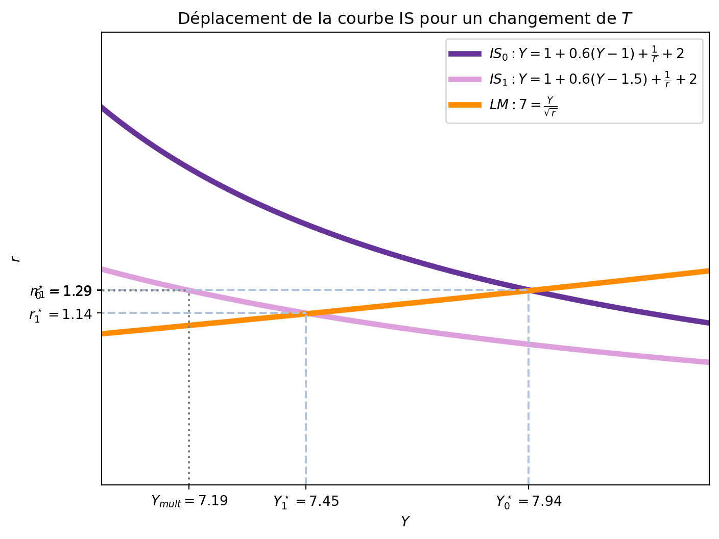 De manière graphique, une augmentation de \(T\) déplace la courbe IS vers la gauche et, en équilibre, réduit le niveau de revenu et le taux d’intérêt.