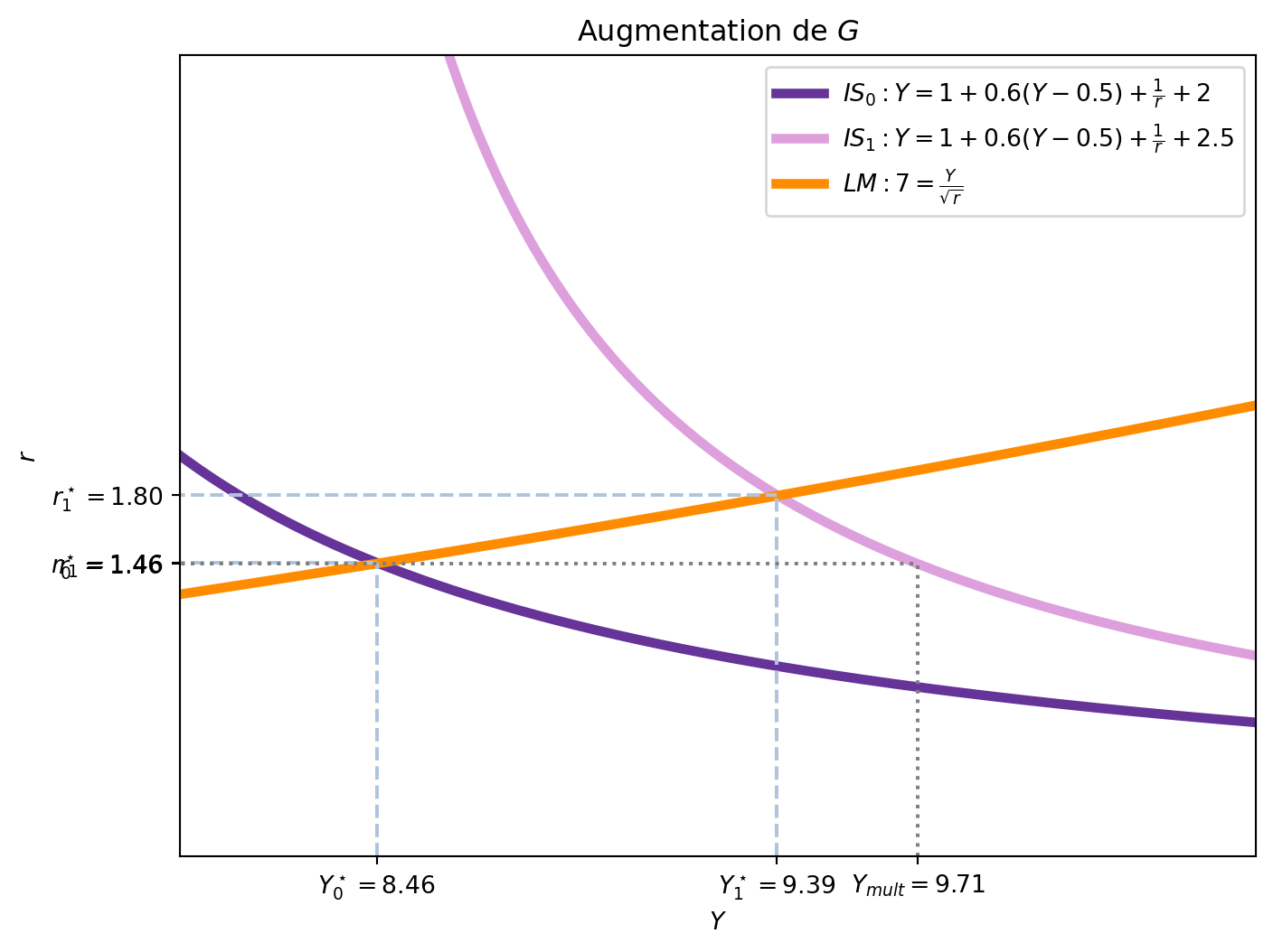 Le changement de \(G\) provoque une chaine de changements dans \(Y\) et \(r\) qu’il faut considérer. Avant, nous avions ignoré les changements dans \(r\), raison pour laquelle le multiplicateur simple de \(G\) était plus grand que l’effet total. Ainsi, nous devons permettre que \(Y\), \(r\) et \(G\) varient.