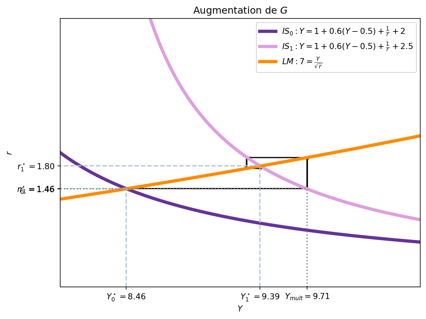 Dans la Figure 5.1, nous avons tracé la courbe IS initiale \(IS_0\) et la courbe IS après l’augmentation de \(G\), \(IS_1\). La valeur du multiplicateur est donnée par \(\frac{1}{1-c_1}\), où \(c_1\) est la propension marginale à consommer et, avec les paramètres choisis, \(c_1 = 0.6\), le multiplicateur est \(\frac{1}{1-0.6} = 2.5\). Ainsi, quand \(G\) augmente de 2 à 2.5 (une augmentation de \(\Delta G = 0.5\)), la courbe IS se déplace vers la droite de \(2.5 \times 0.5 = 1.25\). On voit le déplacement de la courbe IS de \(IS_0\) à \(IS_{mult}\), avec les valeurs \(8.46\) et \(9.71\), soit une augmentation de \(1.25\).