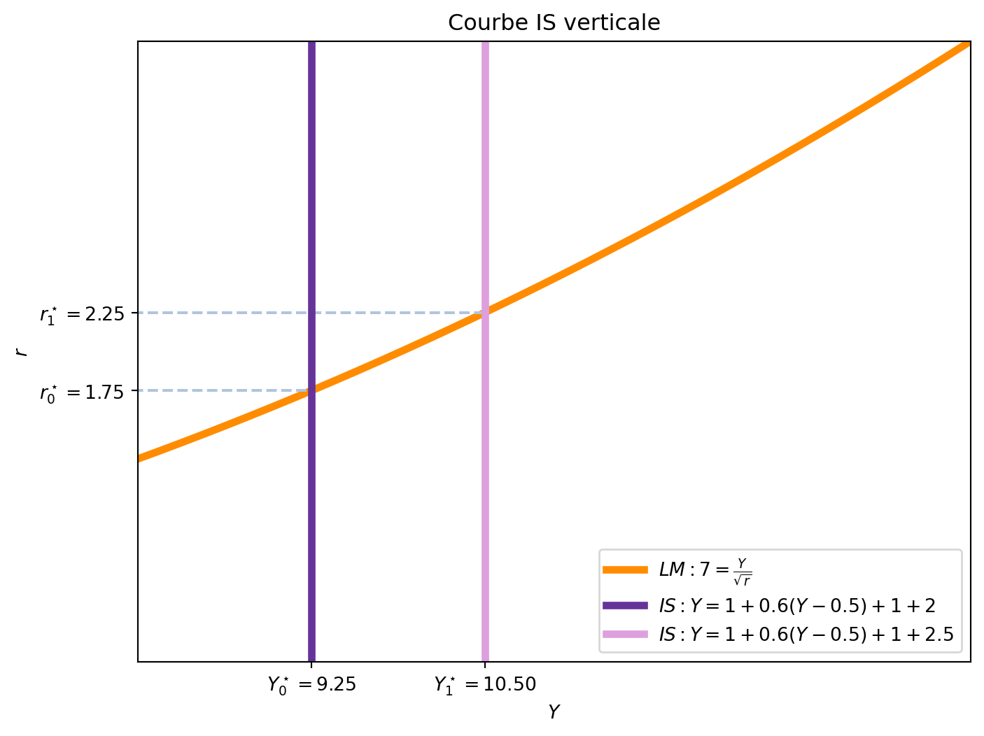 - La sensibilité de l’investissement au taux d’intérêt (\(I^\prime\)): Si l’investissement est très sensible aux variations du taux d’intérêt, l’effet d’éviction sera plus important. Si c’est le cas, une petite augmentation du taux d’intérêt entraînera une réduction importante de l’investissement, ce qui réduira le revenu national. Et, au contraire, si l’investissement est peu sensible aux variations du taux d’intérêt, l’effet d’éviction sera moins important. Dans le cas extrême où l’investissement est constant, \(I^\prime = 0\), l’effet d’éviction est nul et le multiplicateur total de \(G\) coincide avec le multiplicateur simple de \(G\). Dans ce cas, la courbe IS devient verticale, car l’augmentation de \(G\) n’affecte pas le taux d’intérêt. Dans la Figure 5.3, nous avons tracé la courbe IS verticale pour le cas où \(I^\prime = 0\), car \(+1\) représente la fonction d’investissement. Avec \(c_1 = 0.6\), le multiplicateur simple de \(G\) est \(2.5\), et le multiplicateur total de \(G\) est également \(2.5\). Appliquées à une augmentation de \(G\) de 0.5, le revenu d’équilibre passe de \(Y_0^\star = 9.25\) à \(Y_1^\star = 10.5\), ce qui correspond à un déplacement de la courbe IS de \(2.5 \times 0.5 = 1.25\).