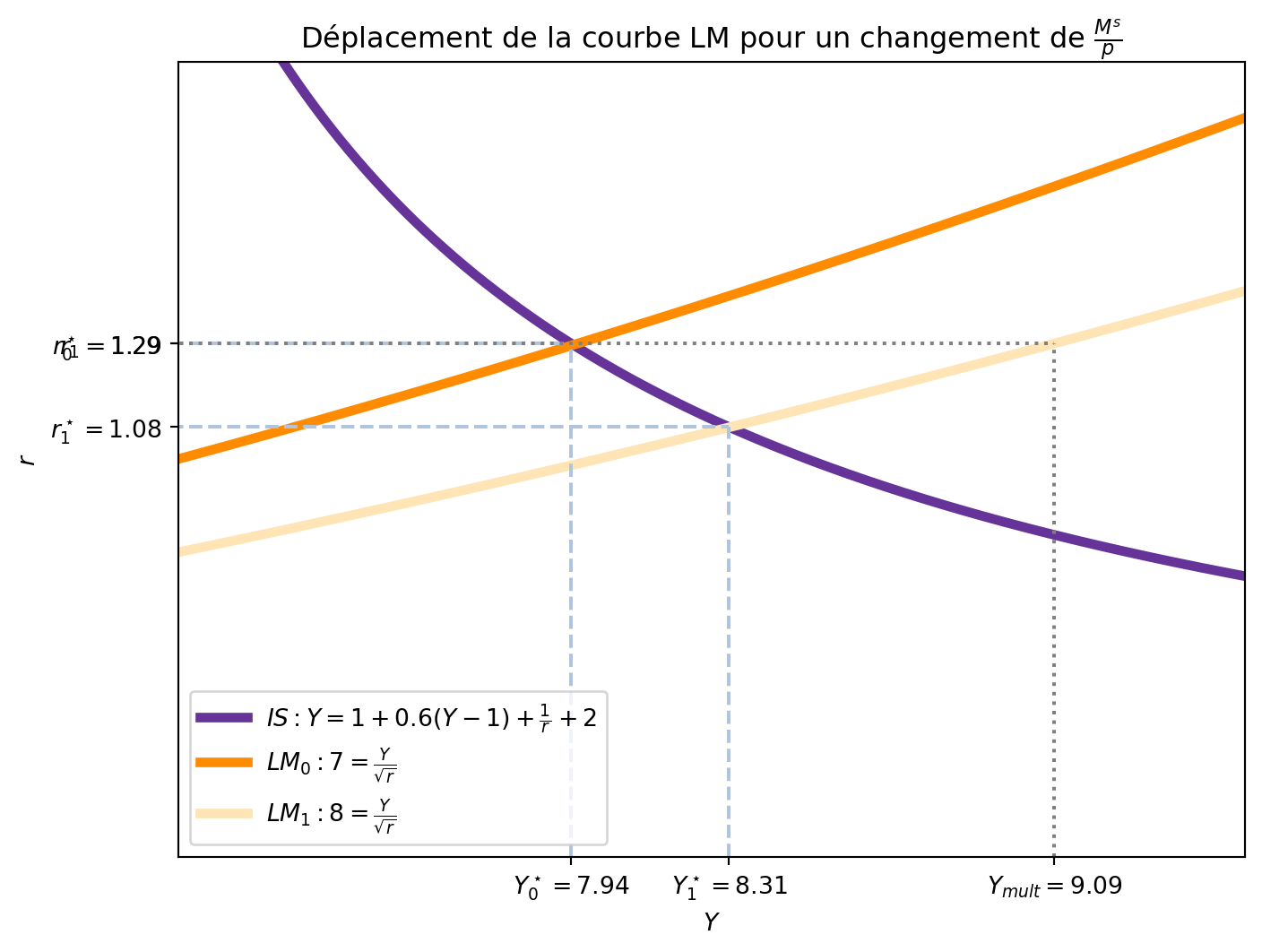 Un changement de \(\frac{M^s}{p}\) provoque une chaine de changements dans \(Y\) et \(r\) qu’il faut considérer. Ainsi, nous devons permettre que \(Y\), \(r\) et \(\frac{M^s}{p}\) varient.