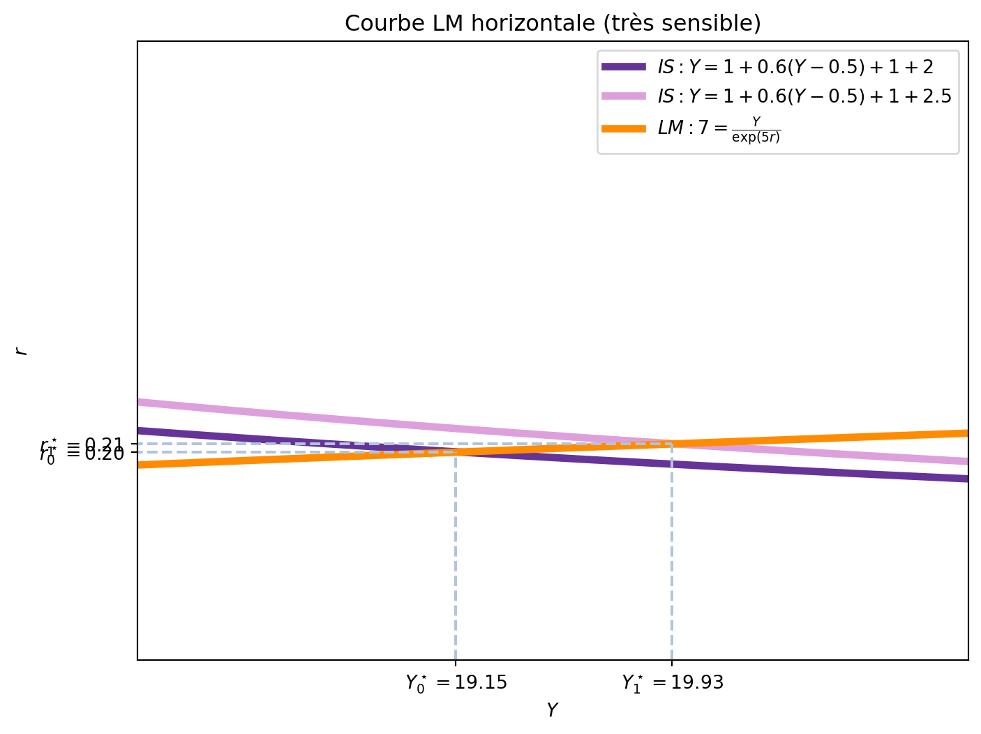 - La sensibilité de la demande d’encaisses réels au taux d’intérêt (\(L^\prime_r\)): Si la demande d’encaisses réels est très sensible aux variations du taux d’intérêt, l’effet d’éviction se minimise. En effet, si la demande d’encaisses réels est très réactive aux variations du taux d’intérêt, une petite augmentation du taux d’intérêt entraînera une réduction très importante de la demande d’encaisses réels. Dans ce cas, il serait possible de compenser l’augmentation de la demande de monnaie induite par \(\Delta G\) avec une augmentation infinitésimale du taux d’intérêt qui ne ferait pas varier l’investissement. Si la demande d’encaisses réels est très réactive par rapport au taux d’intérêt, la courbe LM devient horizontale. La Figure 5.5 montre une courbe LM presqu’horizontale pour le cas où \(L^\prime_r \rightarrow \infty\). Si nous considérons \(c_1 = 0.6\), le multiplicateur simple de \(G\) est \(2.5\), et le multiplicateur total de \(G\) est \(\frac{1}{1-0.6+ (-\frac{1}{r}) \frac{1}{\exp(5 r)} \frac{-\exp{5r}}{5Y}} = \frac{1}{1-0.6+\frac{1}{5 r Y}}\) qui, évalué à l’équilibre initial, de \(Y_0^\star = 19.15\) et \(r_0^\star = 0.2\) est de \(2.21\), assez proche de \(2.5\).