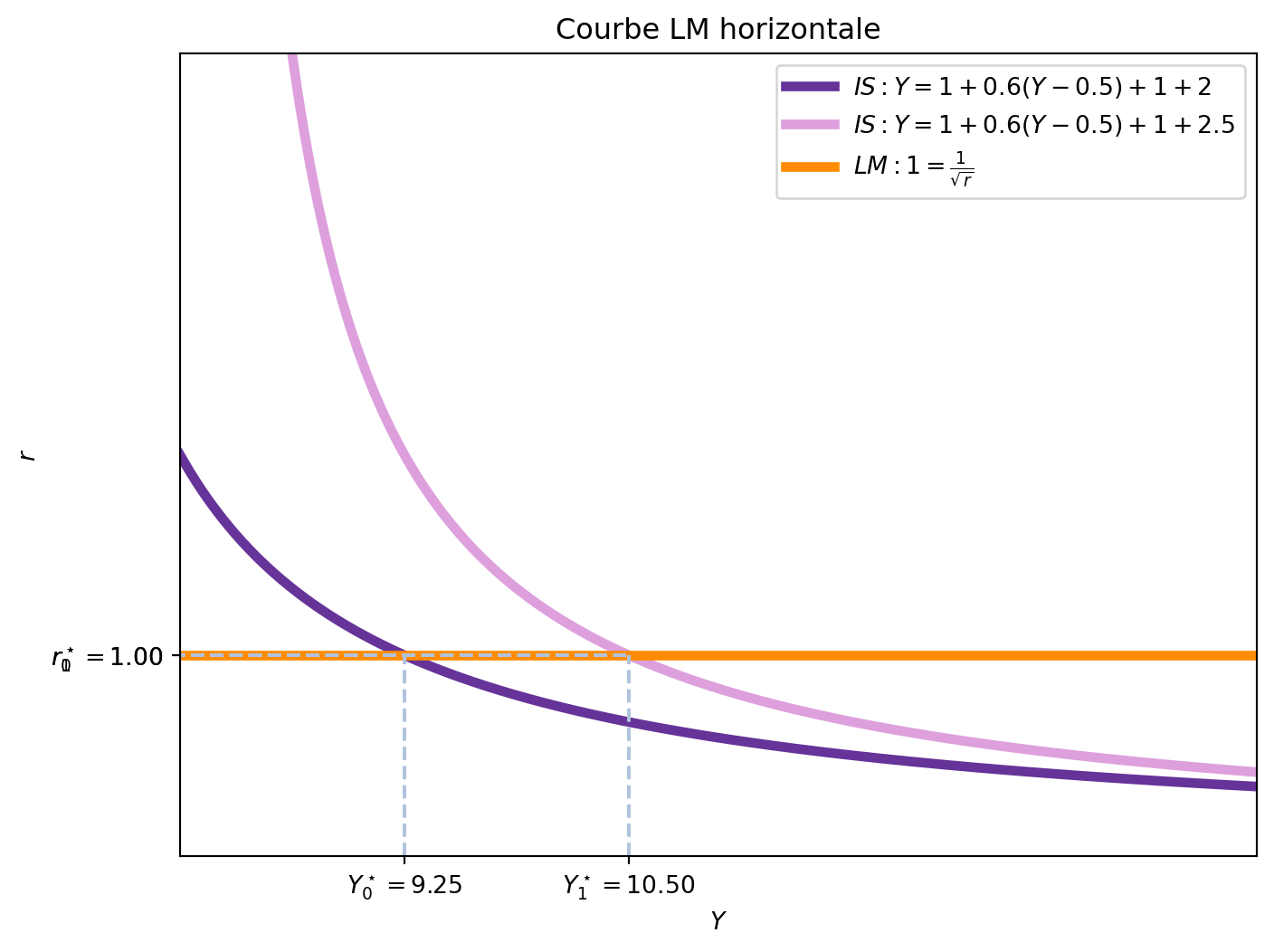 - La sensibilité de la demande d’encaisses réels au revenu (\(L^\prime_Y\)): Si la demande d’encaisses réels ne dépend pas du niveau de revenu, l’effet d’éviction devient nul. En effet, si la demande d’encaisses réels ne change pas avec le revenu, l’augmentation de \(Y\) n’entraîne pas une augmentation de la demande d’encaisses réels, ce qui signifie que le taux d’intérêt ne doit pas augmenter pour rétablir l’équilibre sur le marché de la monnaie. Dans ce cas, la courbe LM devient horizontale, car l’offre de monnaie est constante et ne dépend pas du revenu. Dans la Figure 5.4, nous avons tracé la courbe LM horizontale pour le cas où \(L^\prime_Y = 0\). Comme \(c_1 = 0.6\), le multiplicateur simple de \(G\) est \(2.5\), et le multiplicateur total de \(G\) est également \(2.5\). Appliquées à une augmentation de \(G\) de 0.5, le revenu d’équilibre passe de \(Y_0^\star = 9.25\) à \(Y_1^\star = 10.5\), ce qui correspond à un déplacement de la courbe IS de \(2.5 \times 0.5 = 1.25\).
