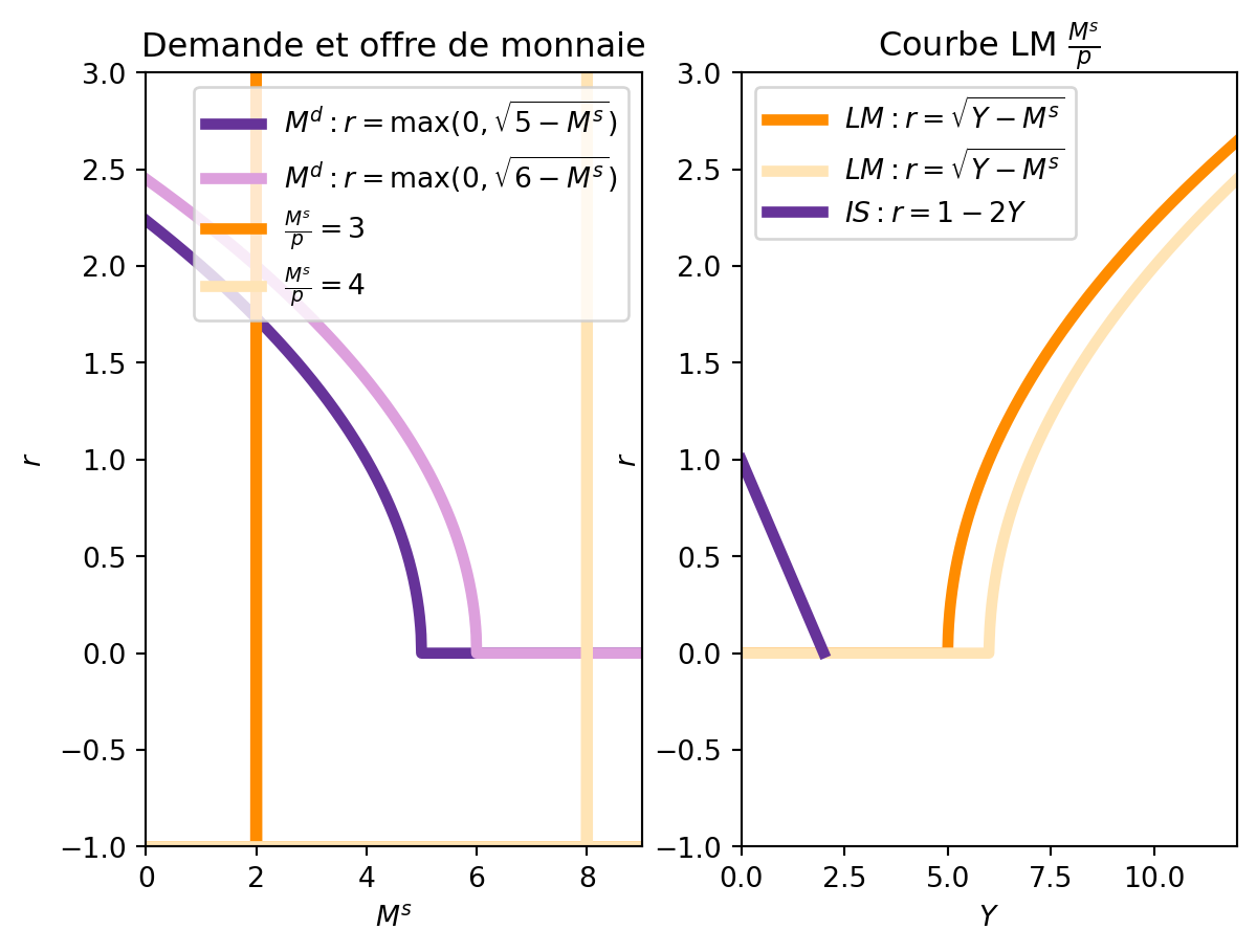 La Figure 5.9 montre un exemple de trappe de liquidité. À gauche, nous avons réprésenté la demande d’encaisses réels \(M^d = L(Y,r) = Y - r^2\). Sur le plan \((M, r)\), la courbe de demande d’encaisses réels est \(r = \sqrt{Y - M^s}\). Cependant, le taux d’intérêt ne peut pas être négatif, donc la courbe de demande d’encaisses réels est limitée à \(r \geq 0\), c’est-à-dire, \(r = \max(0, \sqrt{Y - M^d})\). Quand \(Y\) augmente, la courbe se déplace vers la droite. Ainsi, pour une offre de monnaie donnée, le taux d’intérêt augmente quand \(Y\) augmente. Cependant, à partir d’un niveau de \(M\), la courbe de demande devient horizontale. Si l’offre monétaire se situe dans cette section, une augmentation de \(Y\) peu ne pas entraîner une augmentation du taux d’intérêt, car les individus sont prêts à détenir n’importe quelle quantité de monnaie sans que le taux d’intérêt n’augmente.