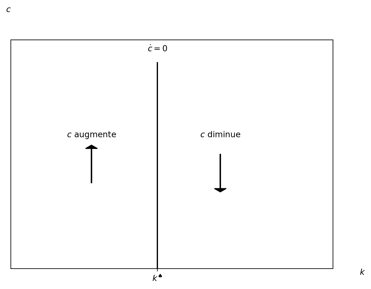 Nous observons que lorsque \(k > k^\spadesuit\), l’équation dynamique de \(c\) est négative, ce qui signifie que \(\dot{c} < 0\) et que la consommation diminue. Graphiquement: