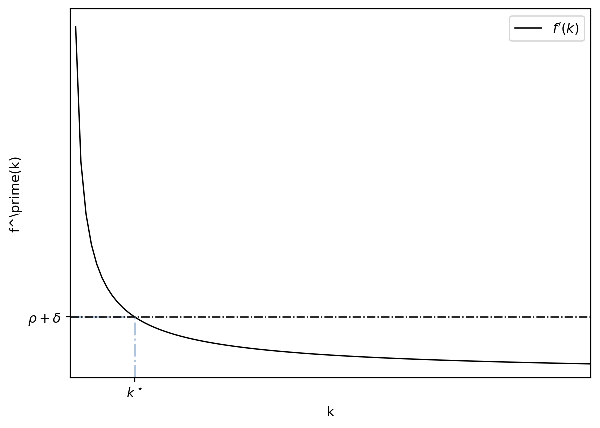 La fonction \(f^\prime(k)\) est décroissante, avec \(\lim_{k\rightarrow 0}f^\prime(k) = \infty\) et \(\lim_{k\rightarrow +\infty} f^\prime(k) = 0.\) Puisque \(\rho + \delta > 0\), il doit exister une valeur entre \((0, +\infty)\) telle que \(f^\prime(k) = \rho + \delta.\) Ceci est une application du Théorème des valeurs intermédiaires Par exemple, si \(f(k)\) est une fonction Cobb-Douglas, soit \(f^\prime(k) = \alpha k^{\alpha-1}\), alors la valeur \(k\) pour laquelle \(\dot{c} = 0\) est \(k = \left(\frac{\rho+\delta}{\alpha}\right)^{\frac{1}{\alpha-1}}.\) Visuellement: