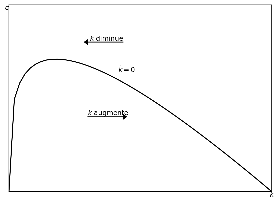 Nous pouvons tracer toutes les combinaisons de \(k\) et \(c\) qui impliquent \(\dot{k} = 0.\) Étant donné les propriétés de \(f(k)\) et le fait que \(\dot{k} = 0 \implies c = f(k) - (n+\delta)k\), la courbe aura la forme d’une parabole inversée. De manière graphique: