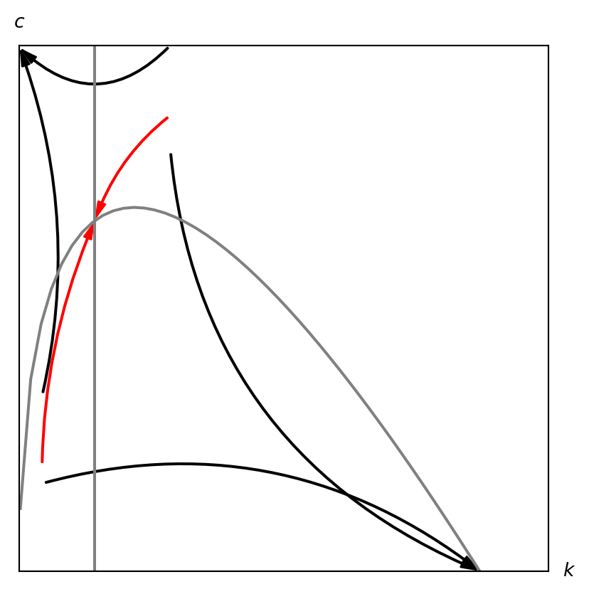 De l’autre côté, la condition de stationnarieté pour \(c\) implique \(f^\prime(k) = \rho + \delta.\) Ainsi, à priori, le maximum de consommation peut être à gauche ou à droite de la droite \(\dot{c} = 0\). La condition de transversalité assure qu’il soit à gauche, c’est-à-dire, avant le maximum et, par conséquent, que \(c^\star > 0.\)