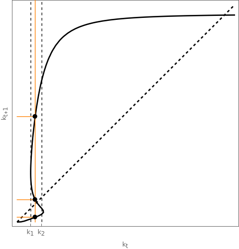- Finally, trajectories starting with \(k_0 > \bar{k}_{a}\) converge towards \(\bar{k}_{b}\), which is a locally stable steady state in \((\bar{k}_{a}, +\infty).\)