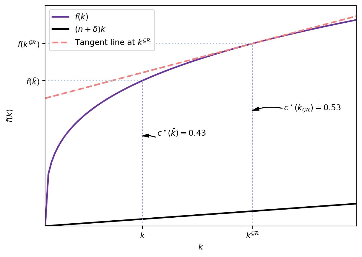 \[ \max \mathfrak{c} = f(k) - (n+\delta)k \implies f^\prime(k^{\mathcal{GR}}) = n+\delta. \]