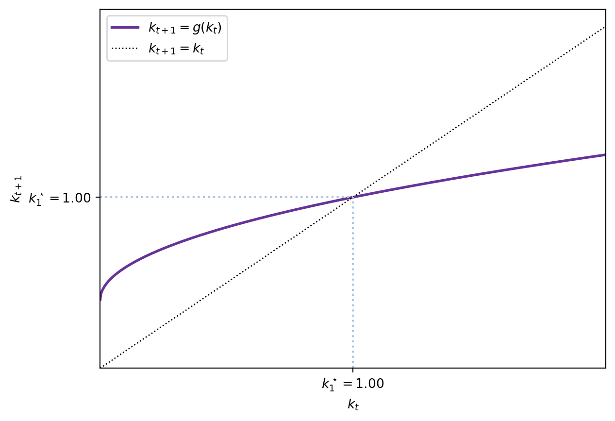 When \(k_t = k_{t+1} = 0\), the value of the derivative is \(+\infty\), and thus, that steady state is non-stable. Moreover, for any value \(k>0\), the derivative is between \(0\) and \(1\). Therefore, any other possible steady state is stable. Because the economy cannot converge to \(k\rightarrow \infty\), and because all the potential steady states with positive capital are stable, this implies that only can exist. Otherwise, all of the would attract the dynamics, but this is impossible in this model: we must converge somewhere. In fact, the plot corresponds to Figure 2.2.